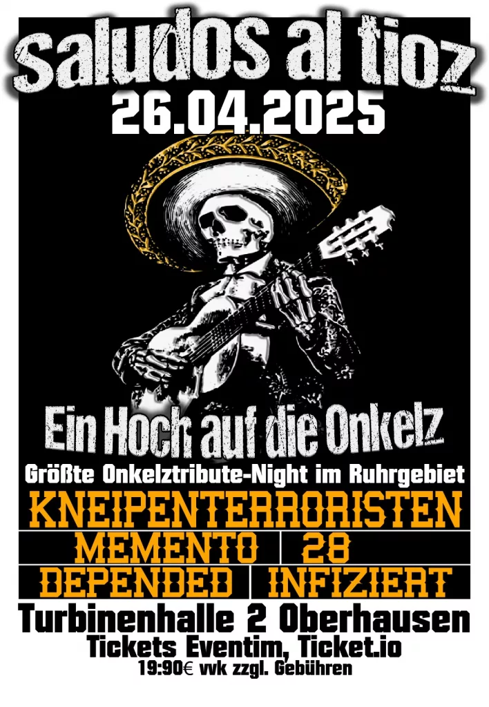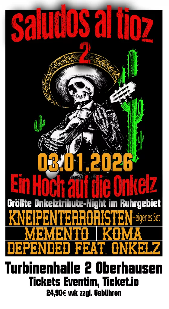Live 2025/2026 15.11.2025 Herne Auf dem Stennert 03.01.2026 Saludos al tioz 2 + Koma , Kneipenterroristen , 28 , Memento …. Teilen auf: